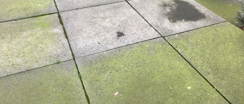 Op deze afbeelding zie je groene aanslag op tegels in de tuin. Een populaire methode om dit weer schoon te maken is om groene aanslag te reinigen met azijn. Maar wist je dat dit helemaal niet mag?